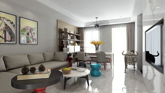 客廳背后是書房,由于男業(yè)主的工作需要,所以封閉的書房是必要的。然而電視墻中間做的玻璃隔斷使得客廳和書房?jī)蓚€(gè)空間可
