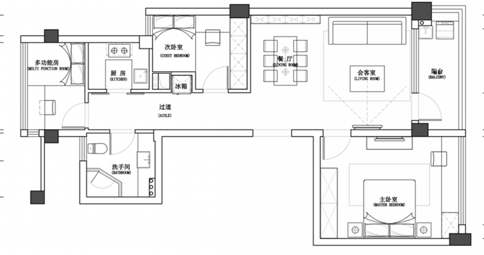 缺點(diǎn):主臥儲(chǔ)物功能一般,外部?jī)?chǔ)藏空間欠缺,動(dòng)靜區(qū)分不明確,需做改動(dòng)增加空間功能性。