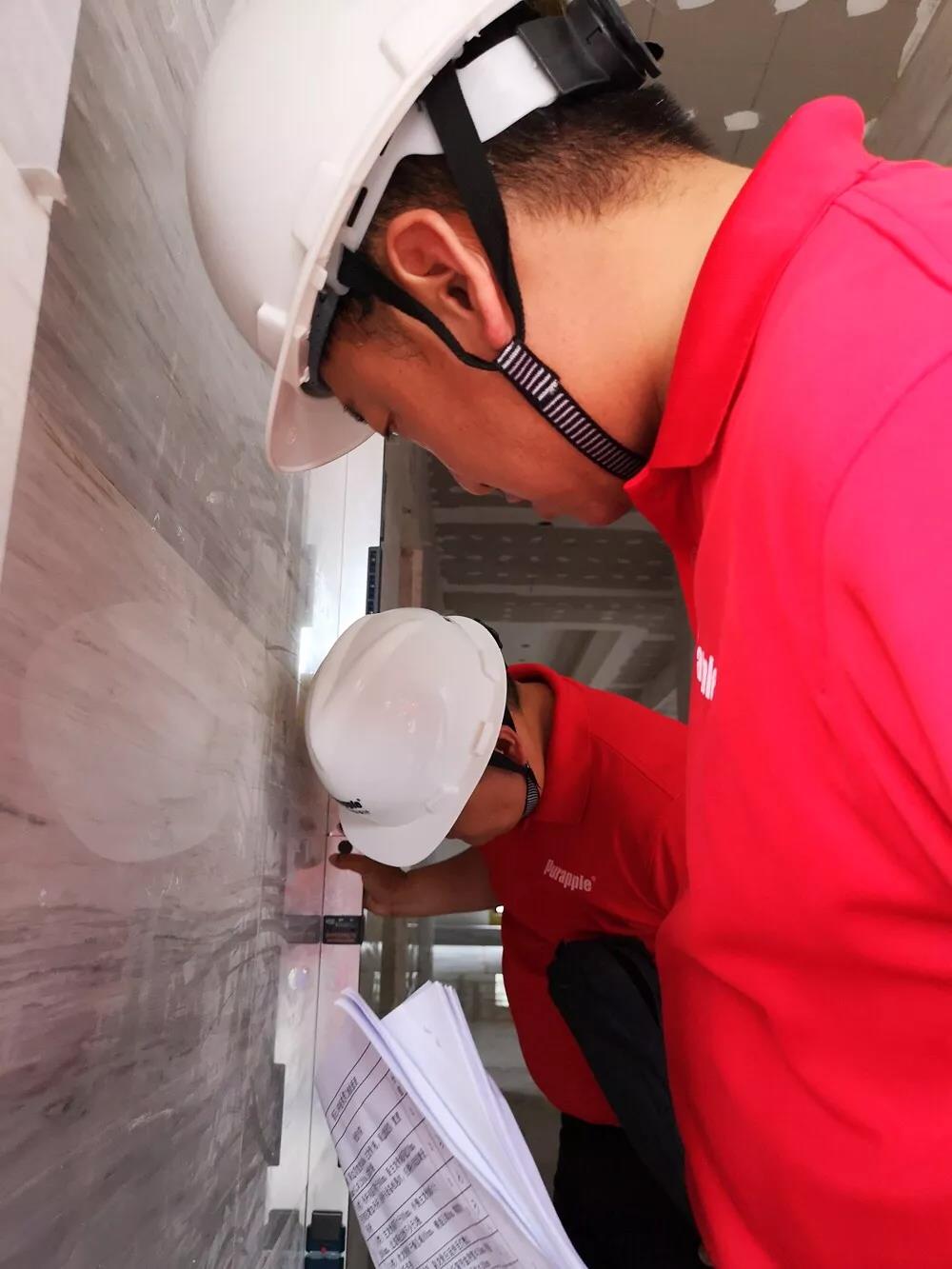 檢查人員按照紫石5.0對在施工地進(jìn)行全面檢測,對施工文明、施工安全、工藝細(xì)節(jié)進(jìn)行測量、記錄。盡管項目面積大,施工難度大,但是有法寶紫石5.0施工體系,施工都能高效、高品質(zhì)的完成。