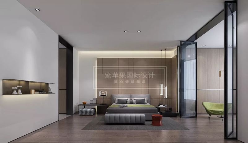 主臥的背景墻運(yùn)用了和木質(zhì)背景,整體質(zhì)感自然細(xì)膩,形成與室內(nèi)其它線條質(zhì)感的呼應(yīng)。