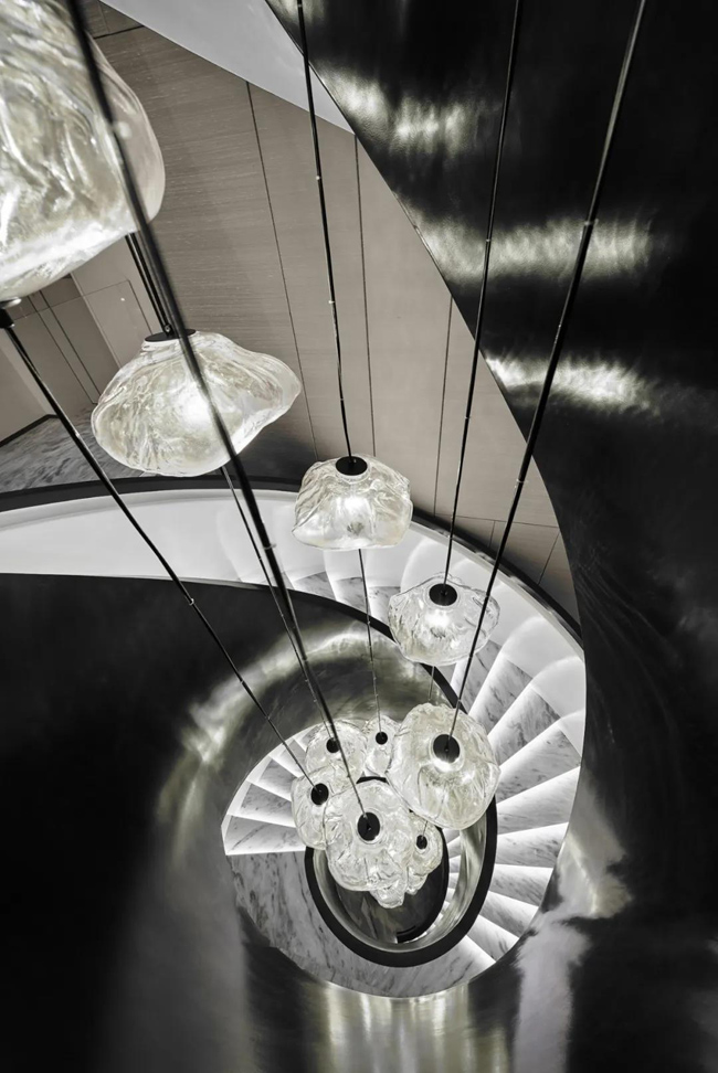 樓梯使用黑白色經(jīng)典搭配,簡約沉穩(wěn),個(gè)性裝飾吊燈,仿佛一幅立體畫般,與整體融合成為立體的藝術(shù)品。