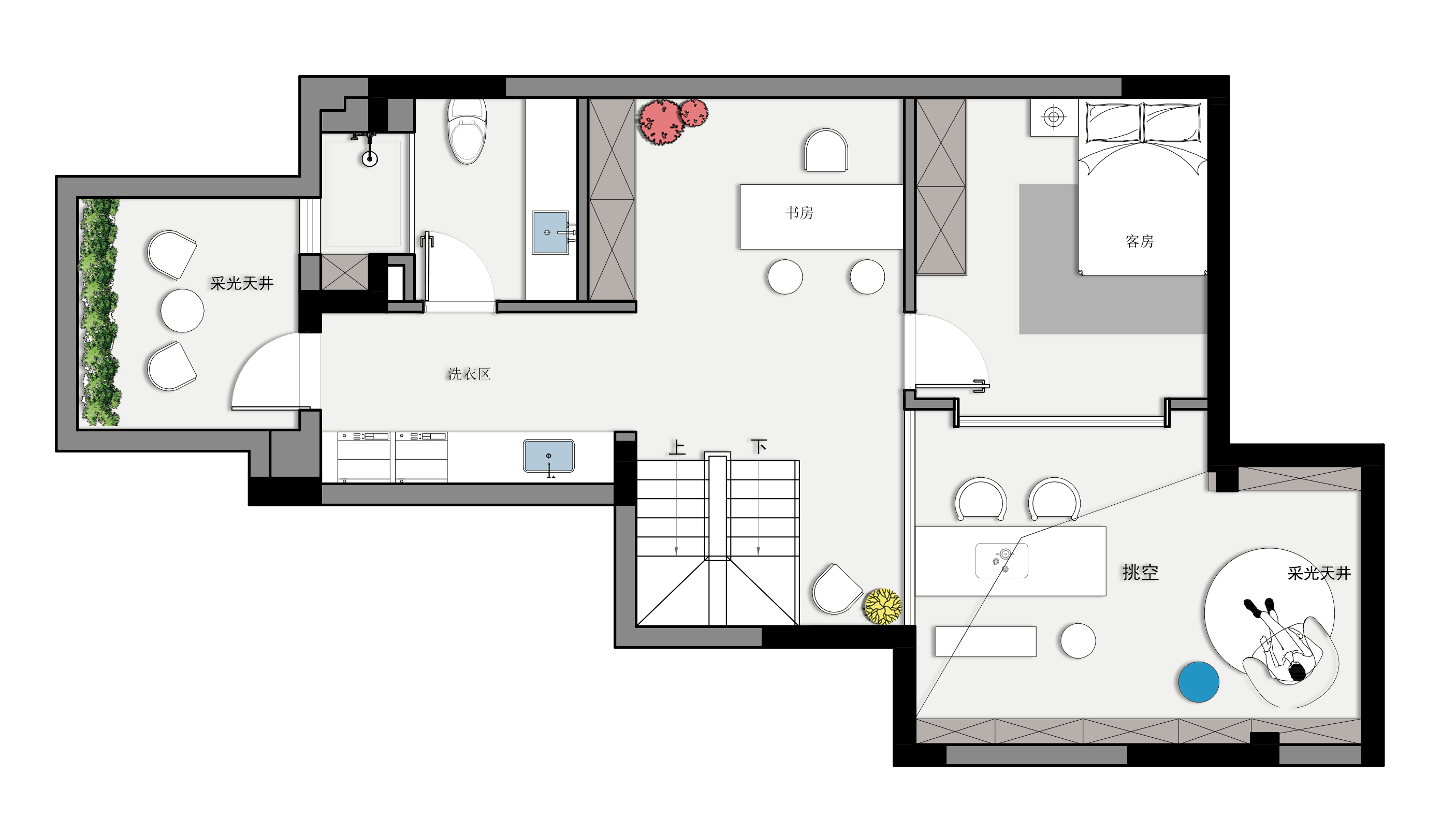 3?負(fù)一層保留了大挑空,結(jié)合少量現(xiàn)澆,把空間變得更方正,利用率更高。將北面采光井也納入室內(nèi)規(guī)劃范圍,難處理的Z字形承重柱用柜子做裝飾,滿足了儲(chǔ)物需求,空間也更加美觀。這個(gè)空間主要作為多功能的書(shū)房和儲(chǔ)物間來(lái)使用,滿足客戶工作、