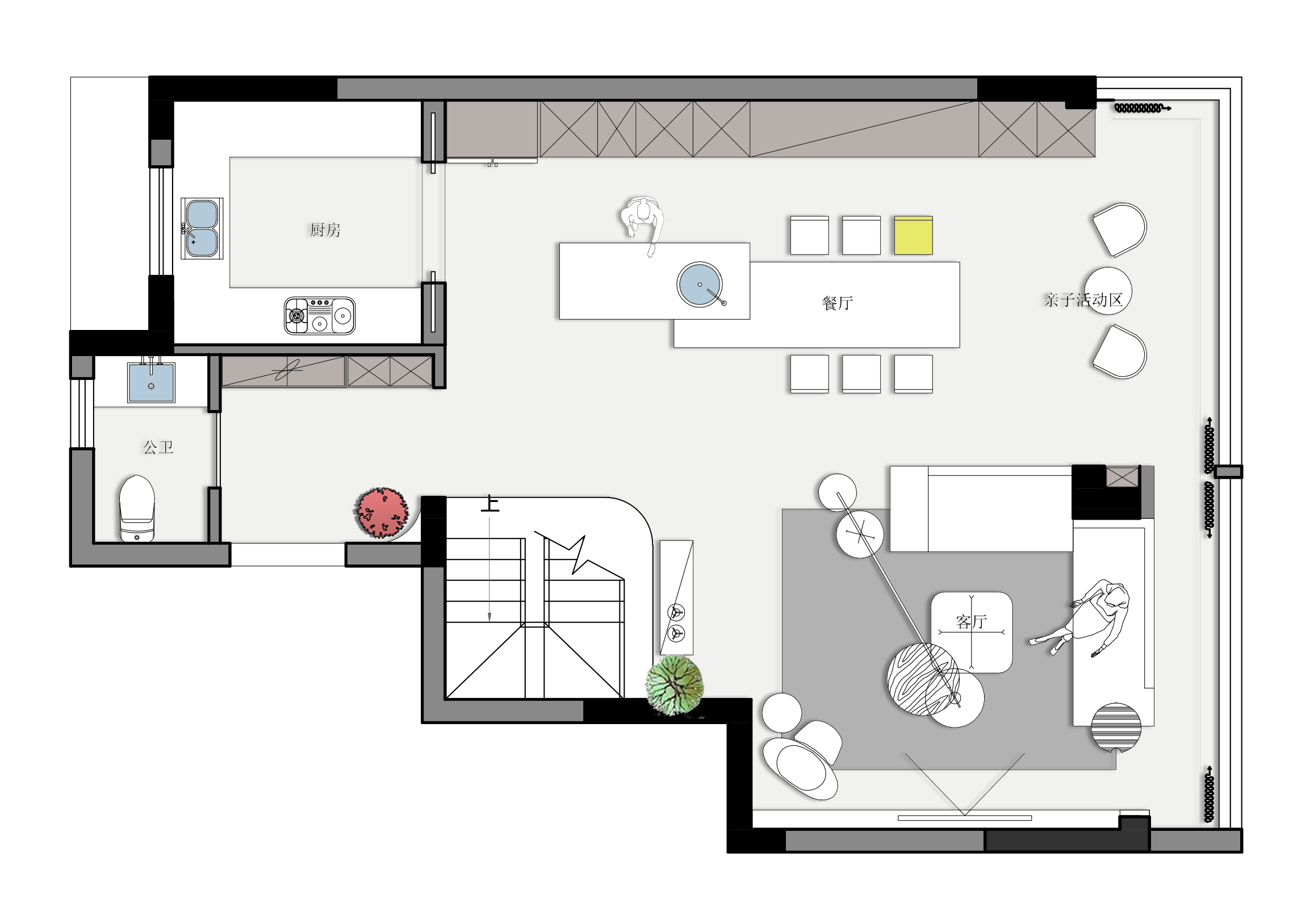 一個(gè)比較大的入戶衣帽間,中廚設(shè)計(jì)了開(kāi)放式和閉式兩種方案,搭配西廚島臺(tái)使用,增加了餐廚空間。在這稿方案中,對(duì)一樓公衛(wèi)進(jìn)行了保留,朝南設(shè)置一