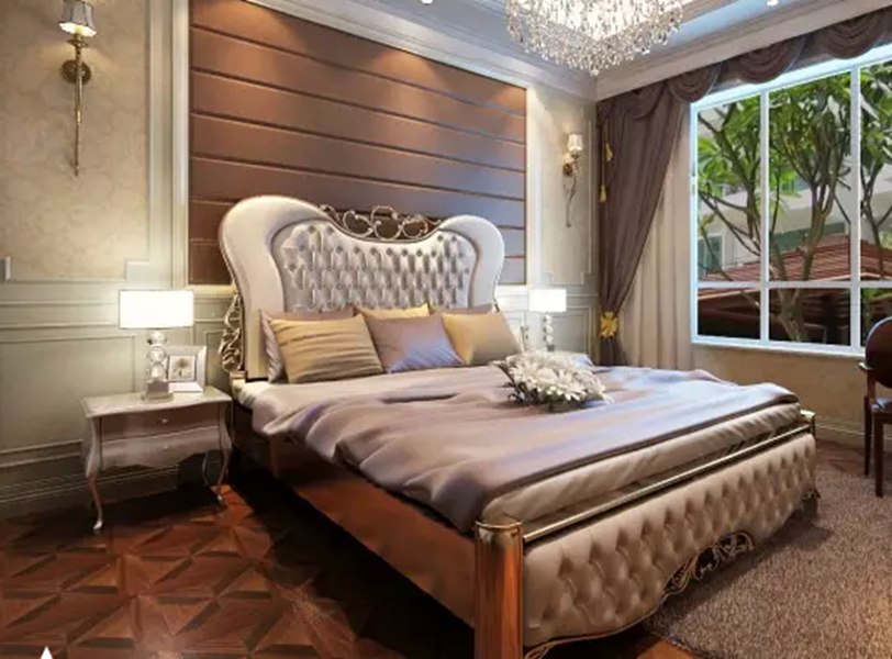象牙白是溫和的顏色,它的浪漫和柔軟讓它與任何顏色的搭配與融合,都能創(chuàng)造出另一種全新的視覺感受,同時也絲毫不會弱化白色的效果。在這間臥房內(nèi),象牙白的運用成為打造寧靜睡眠環(huán)境的最好選擇。墻壁與床頭在花式上的統(tǒng)一則將床體空間的睡眠氛圍無限延伸,整體素雅干凈簡單的視覺效果因為金黃色的加入而融入了一些奢華感。