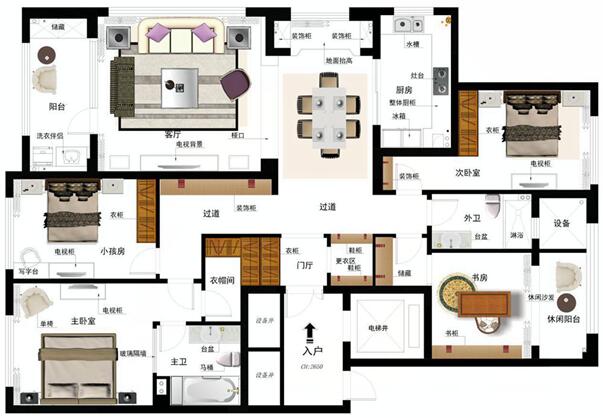 業(yè)主的需求:對功能要求比較全(獨立書房、衣帽間,儲藏室等),且在滿足功能的前提下,首先通過對整體空間的局部改造,是整體布局更趨合理化;淺色調(diào)為主,富有家的溫馨。