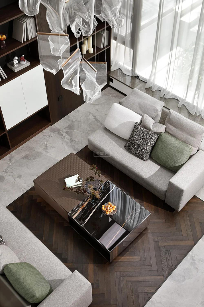 The high space of the living room makes it more stretched. The exquisite chandelier carrying the elements of flowing water opens the new aesthetic expression of life.