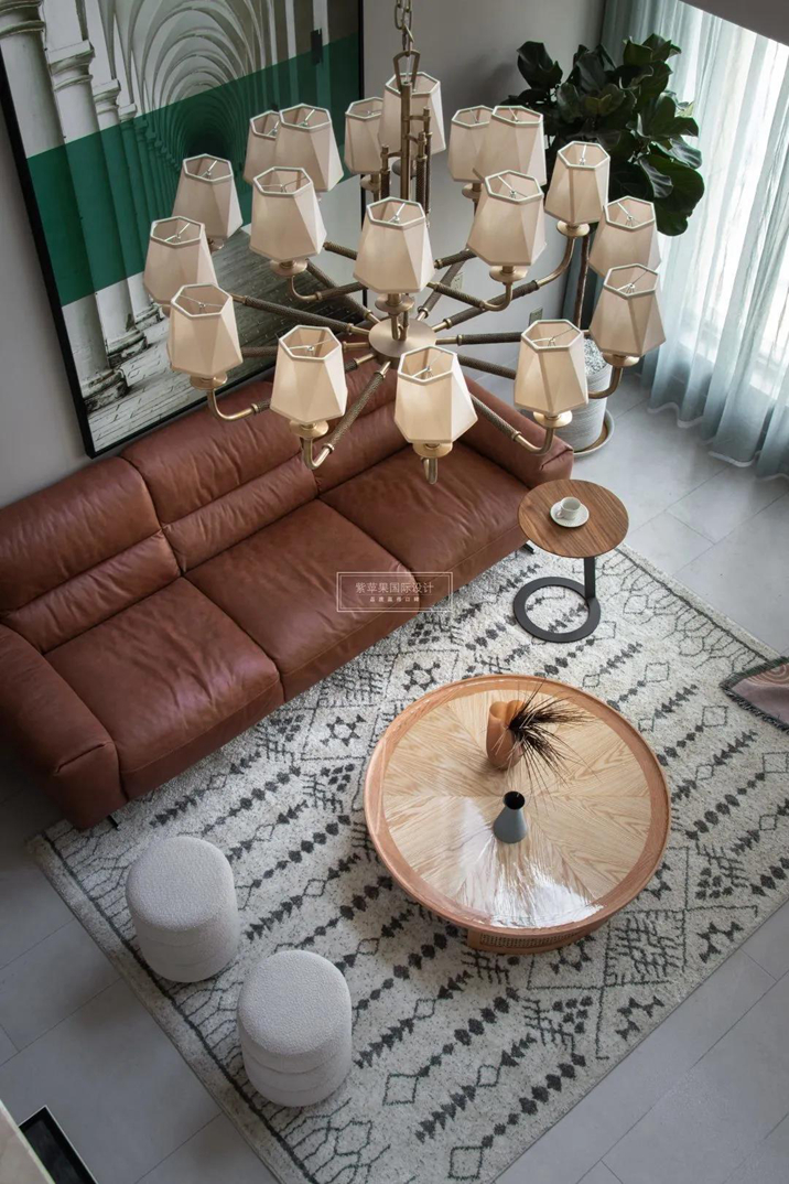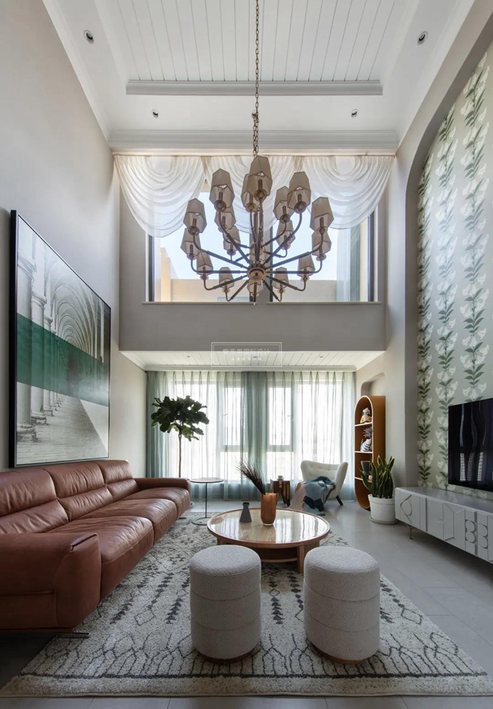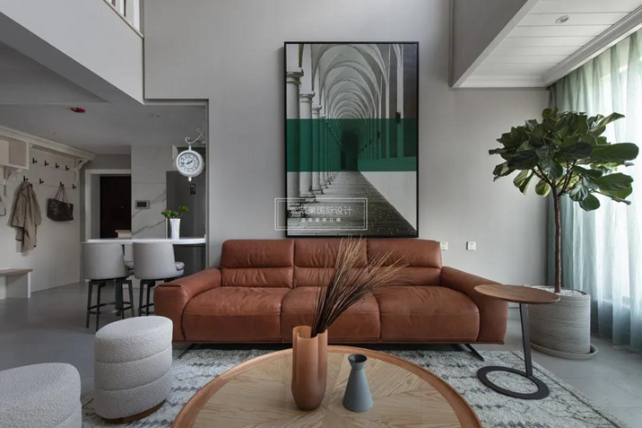 客廳里最佳的C位是棕色的三人沙發(fā),配合焦點(diǎn)透視的藝術(shù)畫,配合大挑空和通透的采光視野,想象中的生活有了畫面。