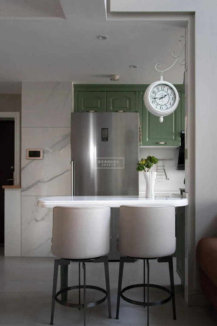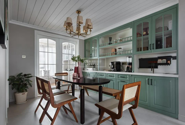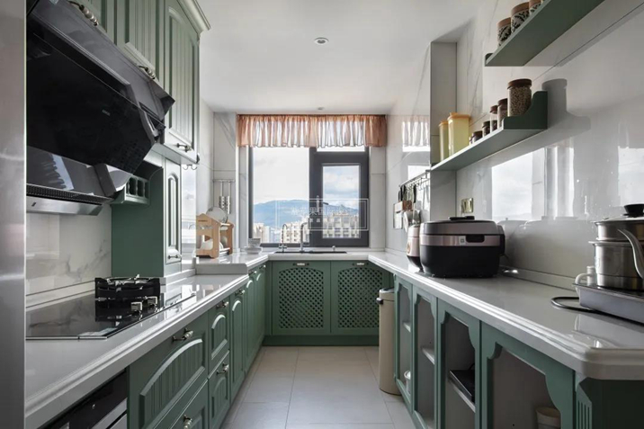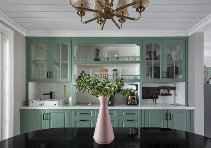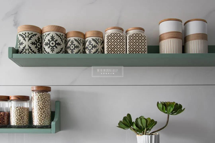 介于寶石綠和湖綠之間的過渡色帶來生機(jī),淡化廚房里的喧雜和煙火軟化生活的棱角。